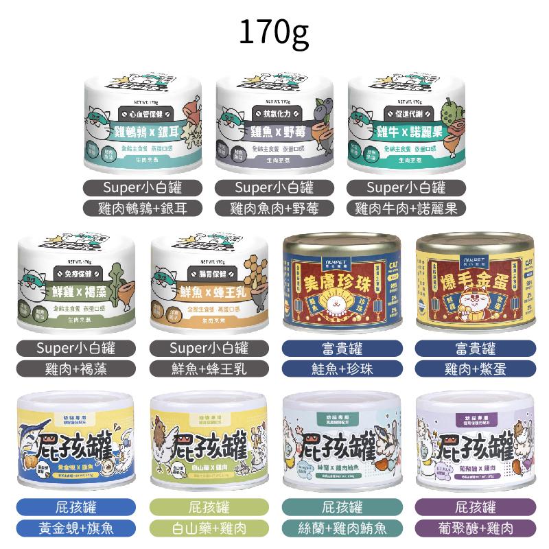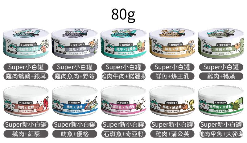 ★小白罐可選的口味:石斑魚X奇亞籽、鮪魚X優格、鮮魚X蜂王乳、鮮雞X蒲公英、鮮雞X褐藻、雞牛X諾麗果、雞魚X野莓、雞鵪鶉X銀耳、雞甲魚X大麥草、鵝肉X紅藜★