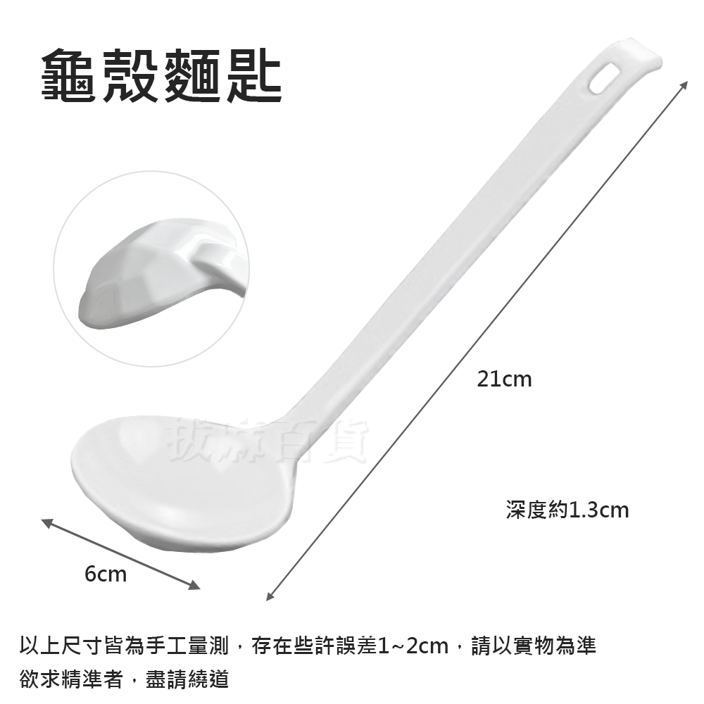 龜殼麵匙:長約 21 cm,寬約 6 cm,深度約 1.3 cm
