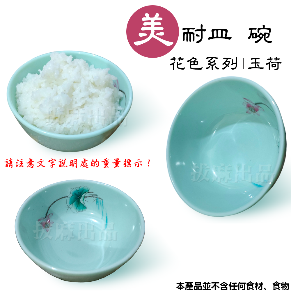 ★美耐皿玉荷系列,碗身如水色、內緣荷花插畫,更以藍綠色為背景,就像是荷花在綠水上一樣