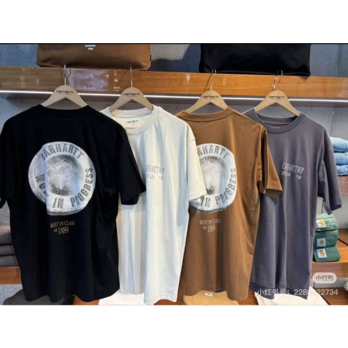 時尚潮流的風格腔調,正面簡約乾淨,胸口 Carhartt WIP的簡介,字母顏色根據衣服顏色搭配不同,撞色顯眼,後背一顆舊紐扣的照片印花,非常寫實,將風格增添了復古的氣息