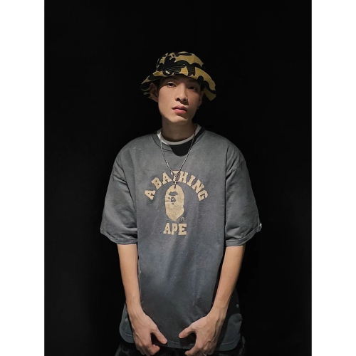 Bape 仿舊裂紋猿人頭字母Logo印花 復古水洗短袖T恤 男女同款