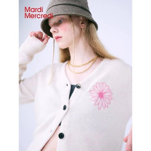 • V領版型搭配雛菊刺繡,修飾頸部線條的同時增添視覺焦點,撞色紐扣與刺繡呼應,讓基礎開衫更具設計巧思