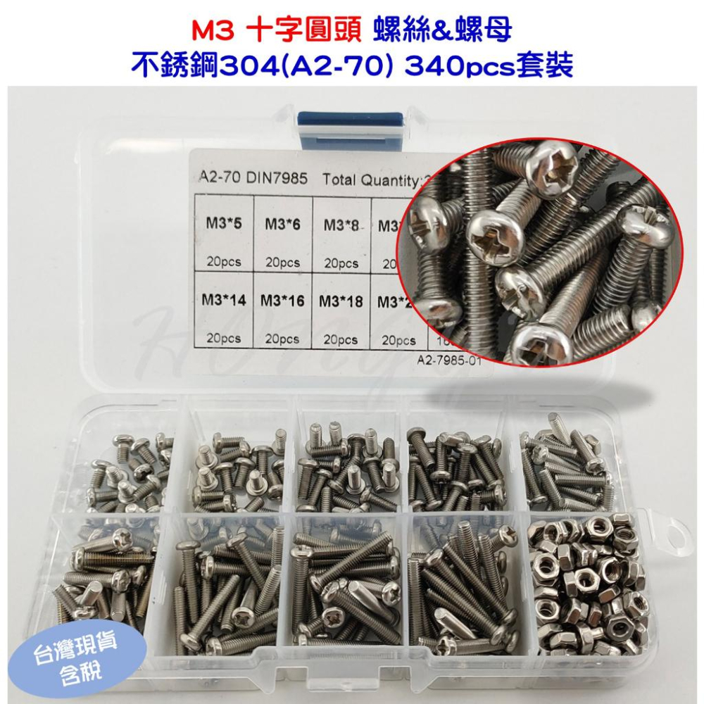 M3 十字圓頭 十字頭 螺絲 螺帽 套裝 組盒 盒裝 共340pcs 配螺母 304(A2-70)不銹鋼 現貨