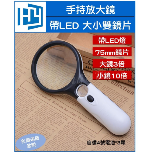 B80 產品名稱說明:帶燈手持閱讀放大鏡 產品型號:6902 主要材質:ABS+玻璃+壓克力 鏡片尺寸:使用75mm鏡片 產品倍數:大鏡3倍 小鏡實際10倍(包裝上寫45倍) 產品顏色: 6902A 正面手柄黑色 6902B 正面手柄白色 6902全黑 6902全白 產品賣點特色:2個鏡片不同倍數,三個LED燈(同時亮),使用3顆4號電池(自備) 產品用途:老外閱讀 看書 學生實驗 戶外點火實驗 家庭放大鏡 下標前注意 1.可下標都是現貨(土城發貨,無自取),下標後24~48小時寄出(遇假日、活動日則順延)。"蝦皮隔日到貨"會盡快寄出,不保證時效。 2.下標後請注意蝦皮聊聊訊息,避免商品、運送問題無法聯繫,導致出貨延遲。 3.超取正常2~4個工作天可到店(不包含蝦皮店到店),實際視訂單物流狀況,可自行追蹤訂單物流詳情,不接受急件,急件可參考蝦皮隔日到貨、黑貓、宅配通(出單後,由快遞安排取件時間,通常為隔天)。以上不保證時效,僅供參考。 4.蝦皮店到店與蝦皮宅配,部分包裹到貨時間可能會一周以上,請自行斟酌。 5.賣場皆含稅並由蝦皮代開電子發票,可參閱賣場首頁圖片操作方式,買家結帳時,請在結帳發票資訊欄位上務必填入正確E-MAIL、抬頭統編(以上資訊我們賣家後台看不到,也無法代為設定),訂單完成後,蝦皮系統會寄出電子發票,賣場不另提供發票,發票相關問題可向蝦皮客服詢問或協助。 6.賣場無實體店面,只有網路,暫無自取。 7.商品若無問題,任意給評4星以下評價(含4星),賣場無提供售後並加黑名單,敬請見諒!!