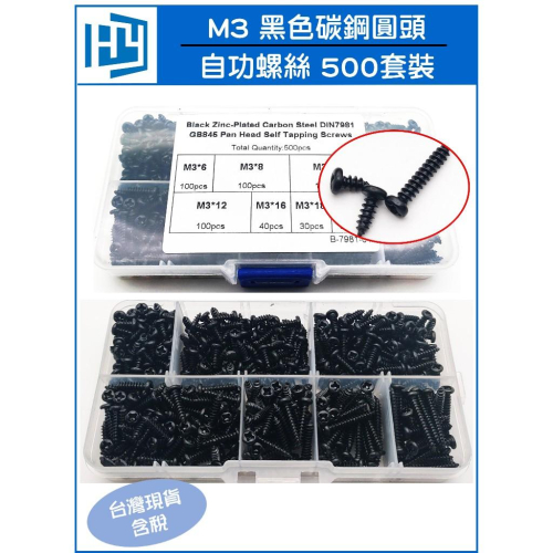 500pcs M3 黑色 碳鋼 圓頭 盤頭 自攻螺絲 螺絲釘 500顆 組合 套裝 盒裝