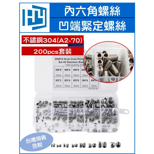 內六角螺絲 DIN914 200pcs凹端緊定 止付螺絲 M3/4/5/6/8 套裝 盒裝 304(A2-70)不銹鋼