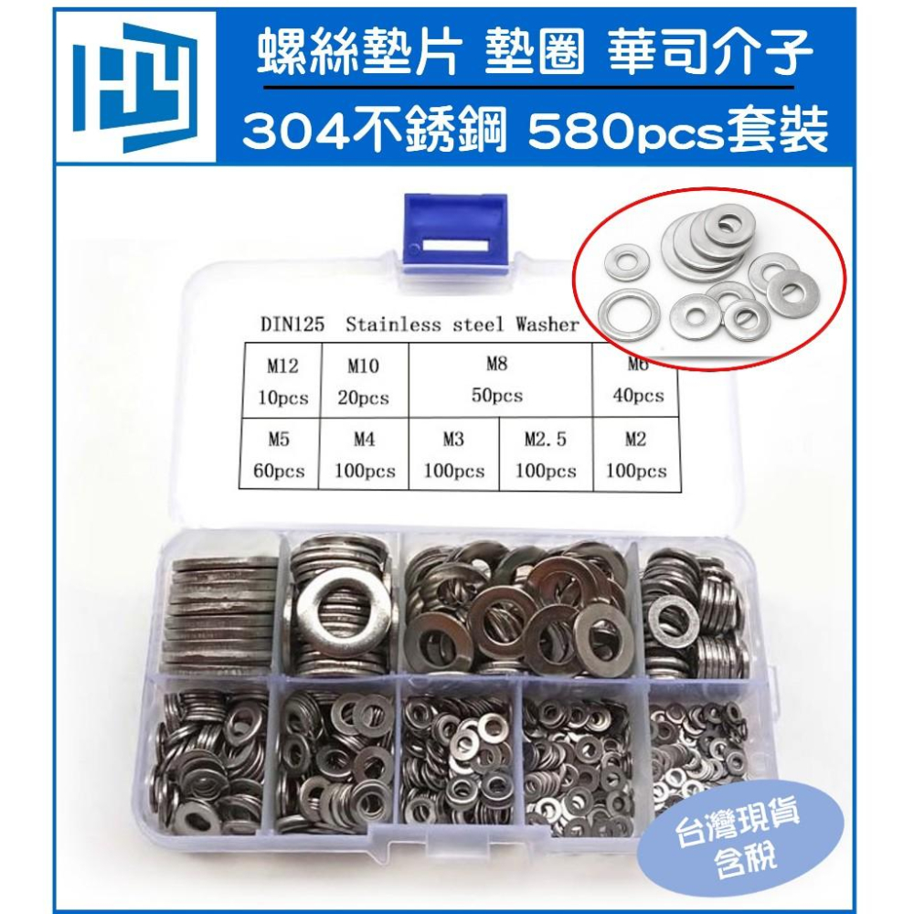 304不銹鋼 螺絲墊片 平墊圈 組合 螺絲墊圈 華司介子 580pcs 墊片 盒裝