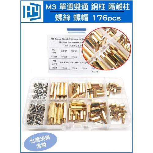 176pcs M3 單通 雙通 銅柱 隔離柱 盒裝 六角 螺帽 螺母 螺絲 176顆 組合 套裝 BD-46