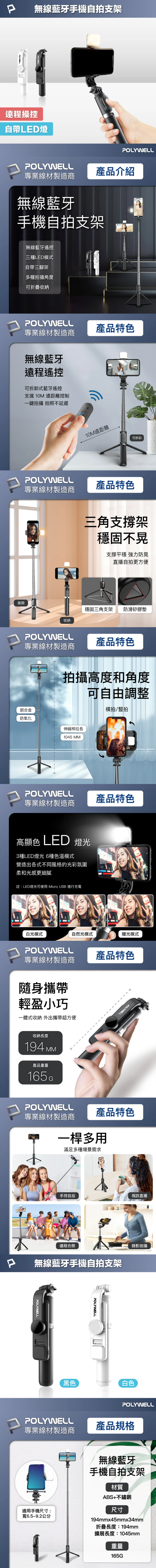 POLYWELL 無線藍芽手機自拍支架