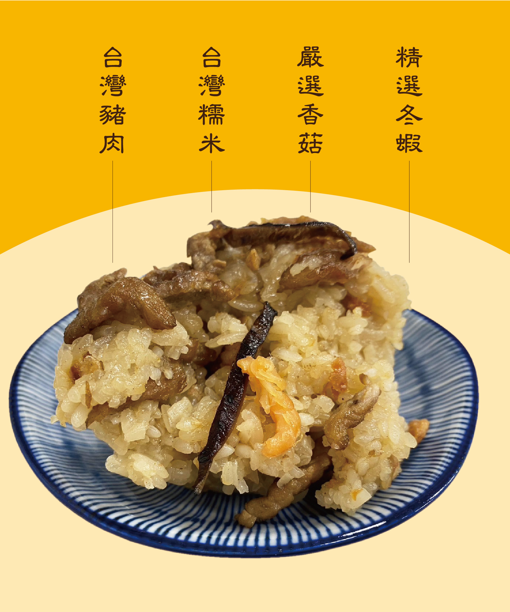 成分:糯米、豬肉(台灣)、香菇、冬蝦、醬油、麻油、調配料