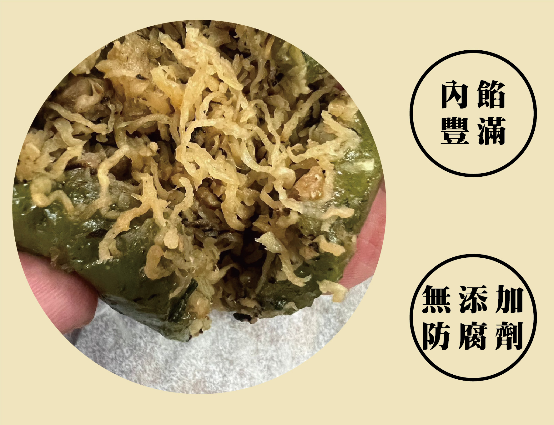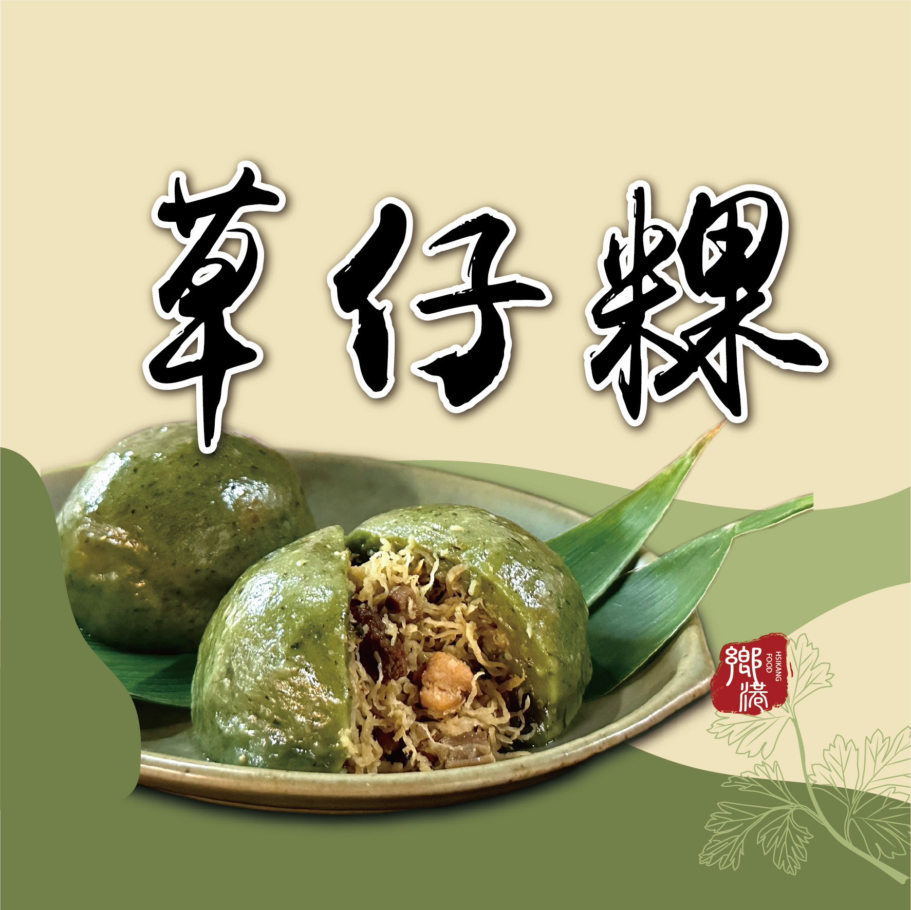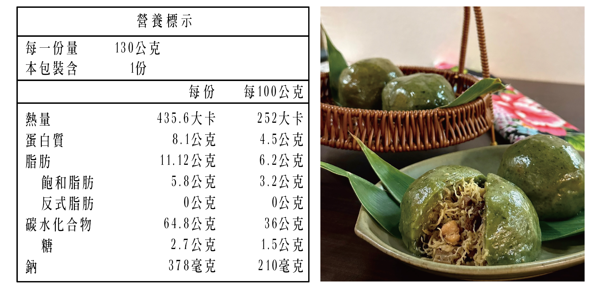 成分:糯米、菜脯絲、豬肉(台灣)、香菇、艾草、紅蔥頭、豬油(台灣)、醬油、糖、鹽、胡椒粉