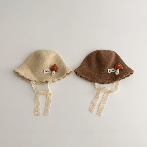 • 可愛香菇毛帽 蕾絲綁帶-奶茶
