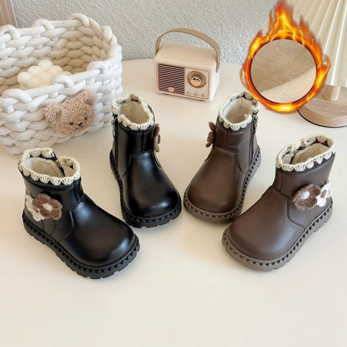 🌊 快速出貨⚡針織花花加絨PU皮短靴 兒童皮鞋靴 膠軟底學鞋 防滑鞋底 學走不掉鞋 可愛童靴子 男女童鞋雪靴