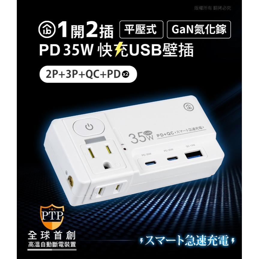 .商品名稱:aibo GaN氮化鎵 平壓式1開2插 高溫斷電智慧 PD35W快充USB壁插