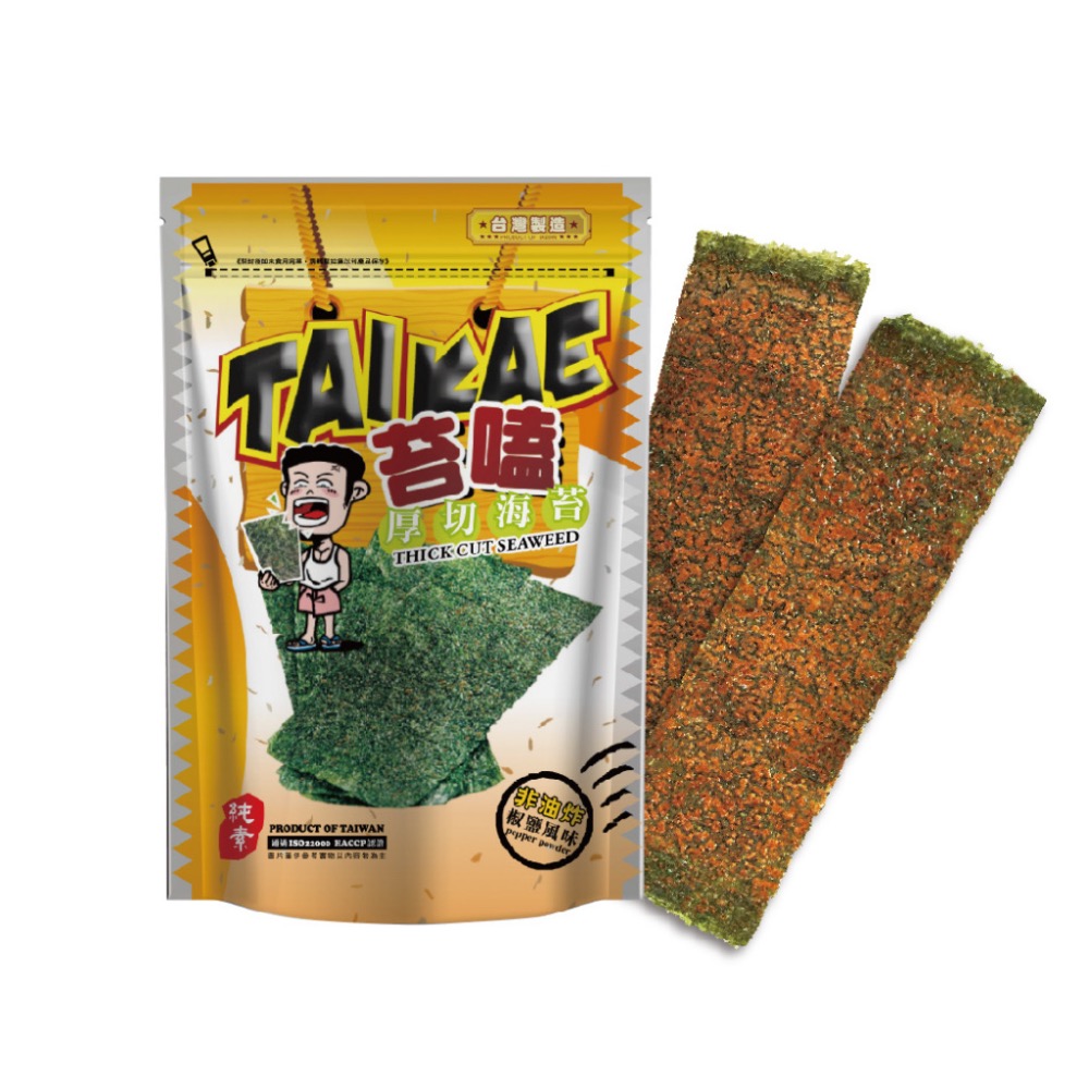 ◆厚切海苔椒鹽風味,有別於一般傳統海苔,獨家特製調味及獨家特有烘烤技術,咬起來咔滋咔滋,口感厚實酥脆中帶有胡椒的微辛香風味。