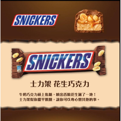 商品名稱:SNICKERS士力架 花生巧克力 (50.5g) 淨重:50g 保存方法:請保存於陰涼乾燥之處, 避免陽光直射 / 蛋奶素 保存期限:52周 有效期限: