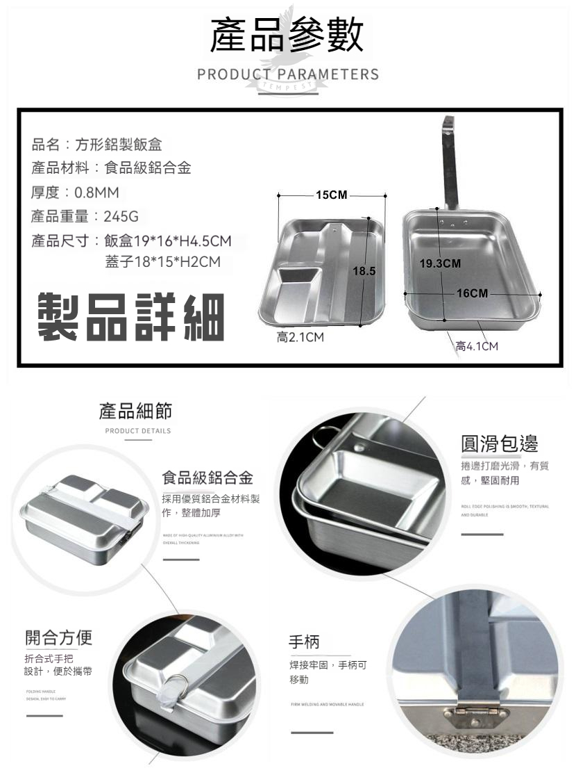 無論您是尋找一個方便攜帶的露營用餐飯盒,還是想要一個多功能的煎鍋,這款鋁合金露營用餐飯盒都是您的最佳選擇。它為您提供了多樣化的烹飪選擇,同時保證了質量、耐用性和輕便性。立即擁有這款飯盒,為您的露營之旅增添美味和便利!