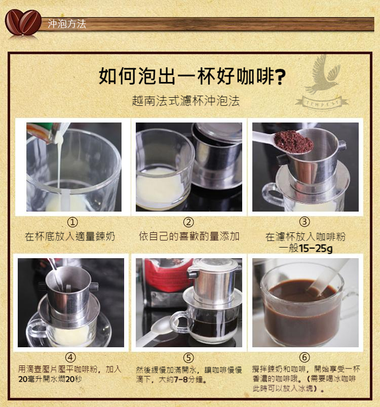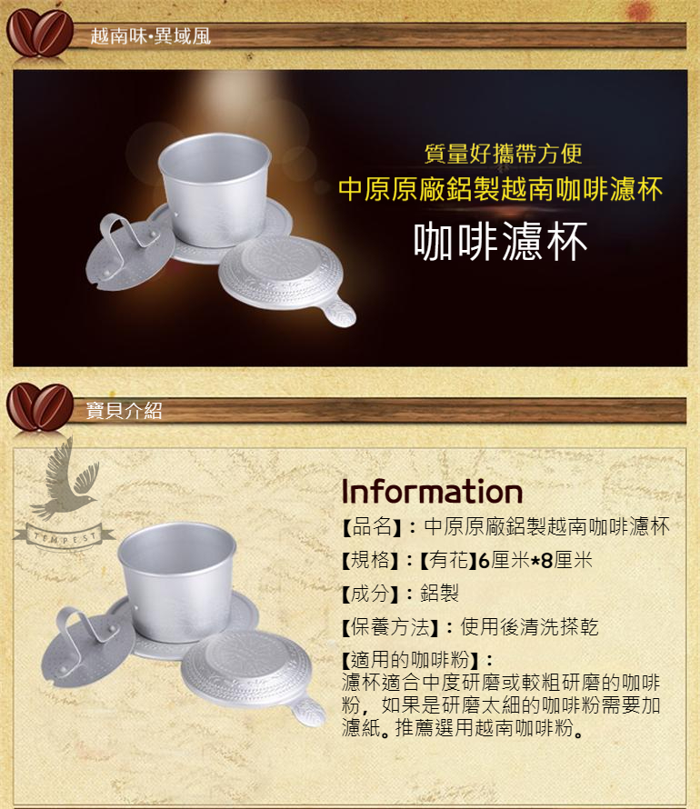 沖泡越南咖啡:Vietnam咖啡濾是專為沖泡越南咖啡而設計,使用傳統濾掛式方法,能輕鬆製作出濃郁風味的越南咖啡。