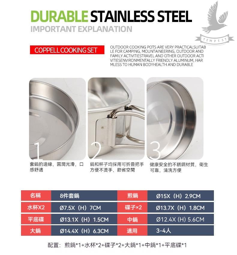 探索露營的極致樂趣,日式露營鍋具組陪您開啟精彩戶外生活!來自日本的品牌保證品質,不鏽鋼材質堅固耐用,多功能煎煮,方便實用;8套件組合,可堆疊一體收納,輕鬆攜帶;摺疊把手設計,有效防止燙傷,安心使用。🏕️🍳🔥