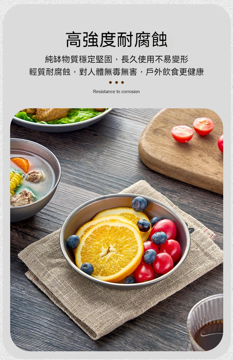 🟦 高耐腐蝕性:純鈦金屬碗具有出色的耐腐蝕性,不易受到酸、鹼等食物成分的侵蝕,碗的表面也不會產生氧化或生鏽。