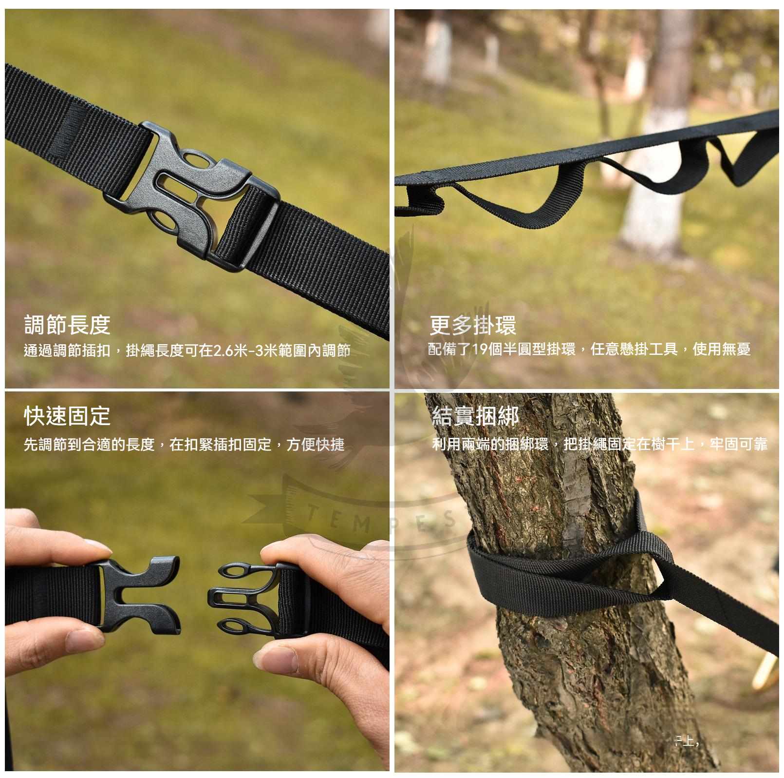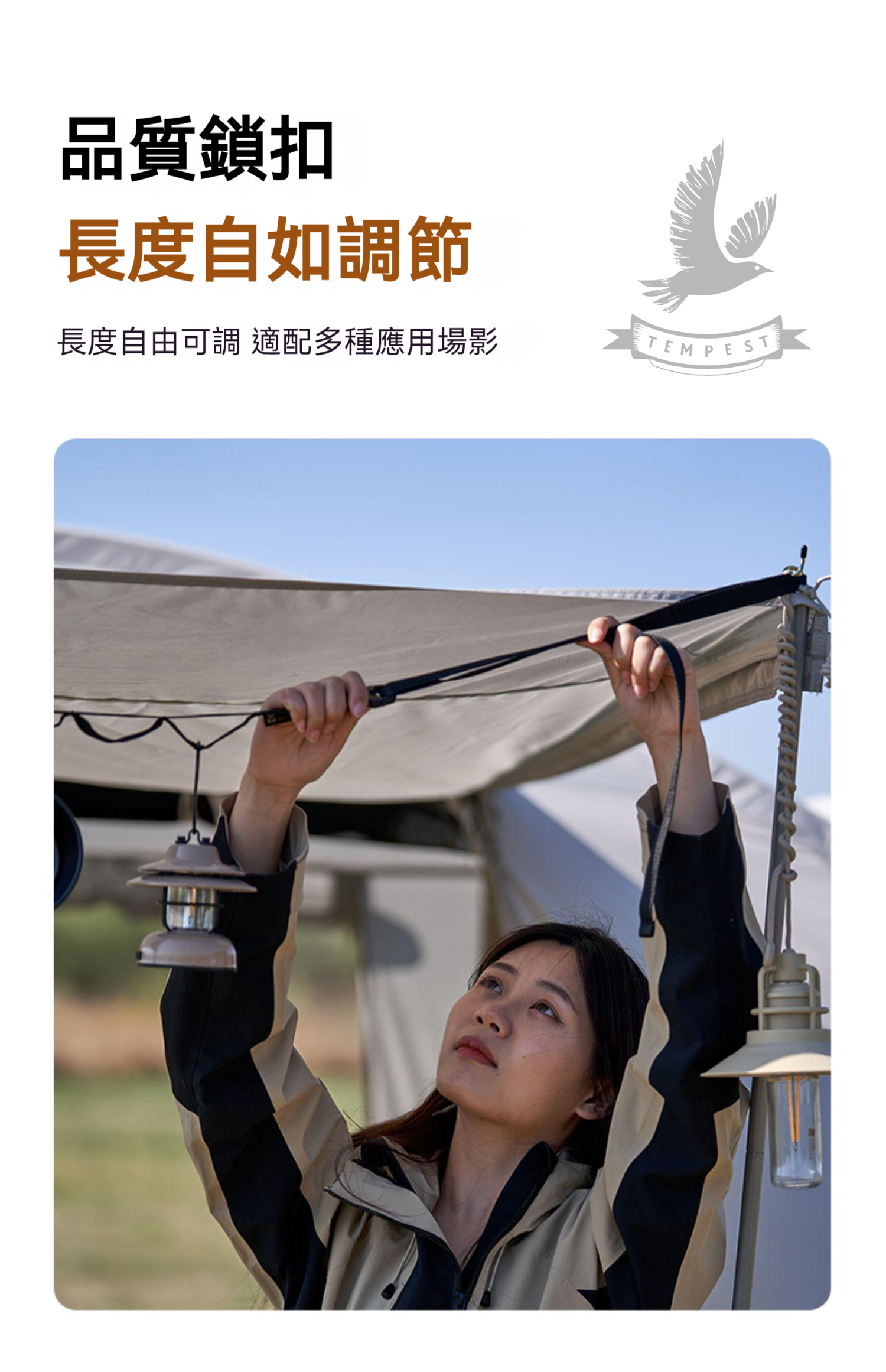 💡 長度調節:露營掛繩的長度可自行調整,可適用於不同營位和用途,與固定長度的掛繩相比更具靈活性。