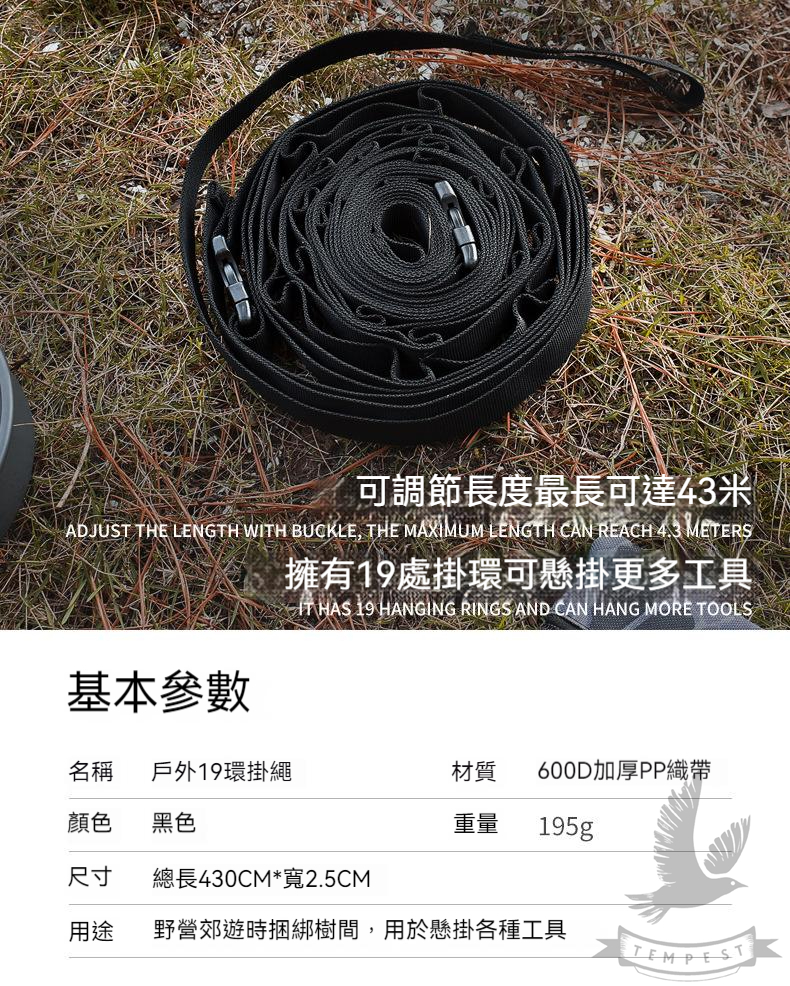 🔹材質:600D加厚PP織帶+19組合金掛勾
