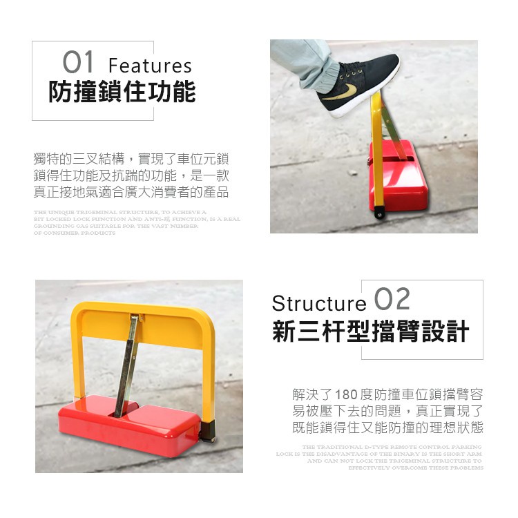 獨特的三叉結構,實現了車位元鎖鎖得住功能及抗踹的功能,是一款真正接地氣的適合廣大消費者的產品。
