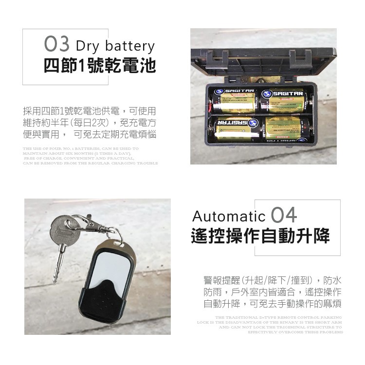 🔸產品內容物:遙控*2 / 鑰匙*2/ 說明書*1 /機器主體*1 / 1號乾電池*4 /鎖地螺絲*3