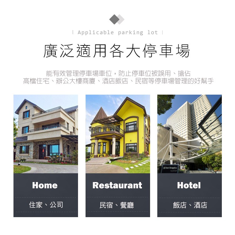 使用壽命長等特點,能有效管理停車場車位,防止停車位被誤用、搶佔,是高檔住宅、商廈、酒店、飯店等停車場管理的好幫手。