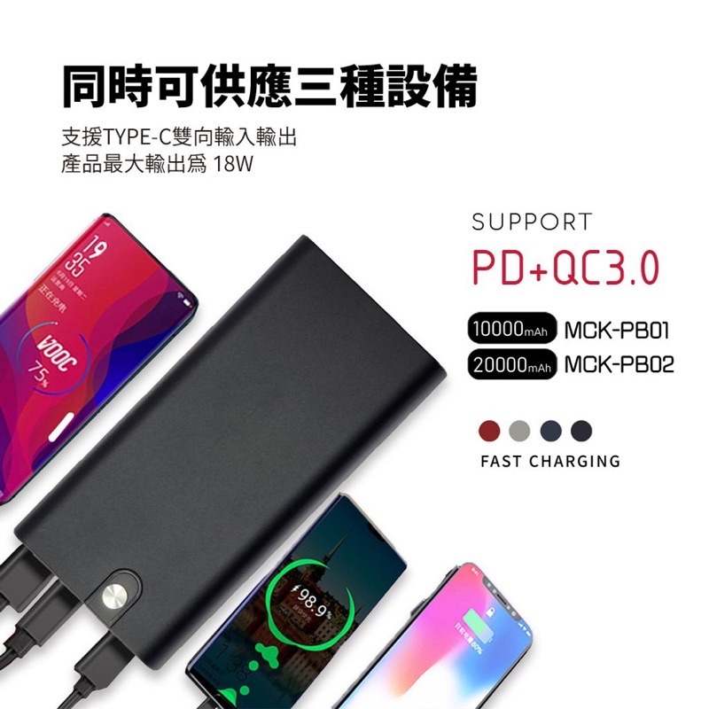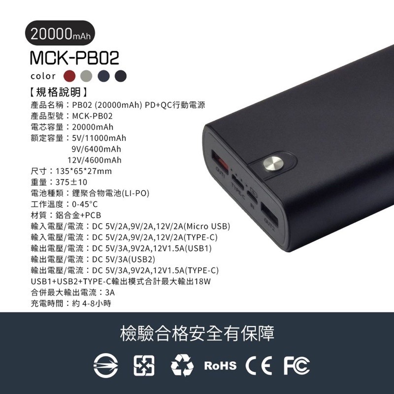 產品名稱:PB02 (20000mAh) PD+QC行動電源