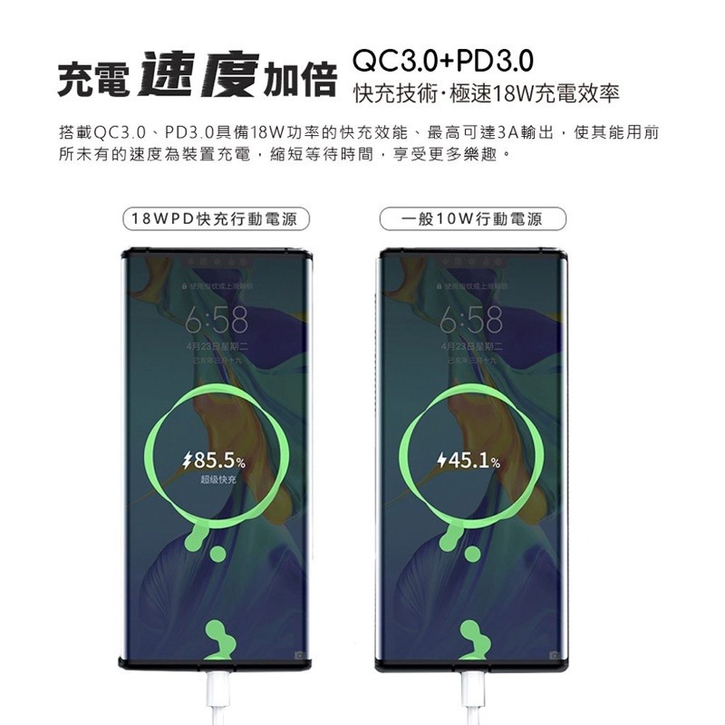 18W超快充電,傳統行動電源的2倍充電速度,更節省時間!