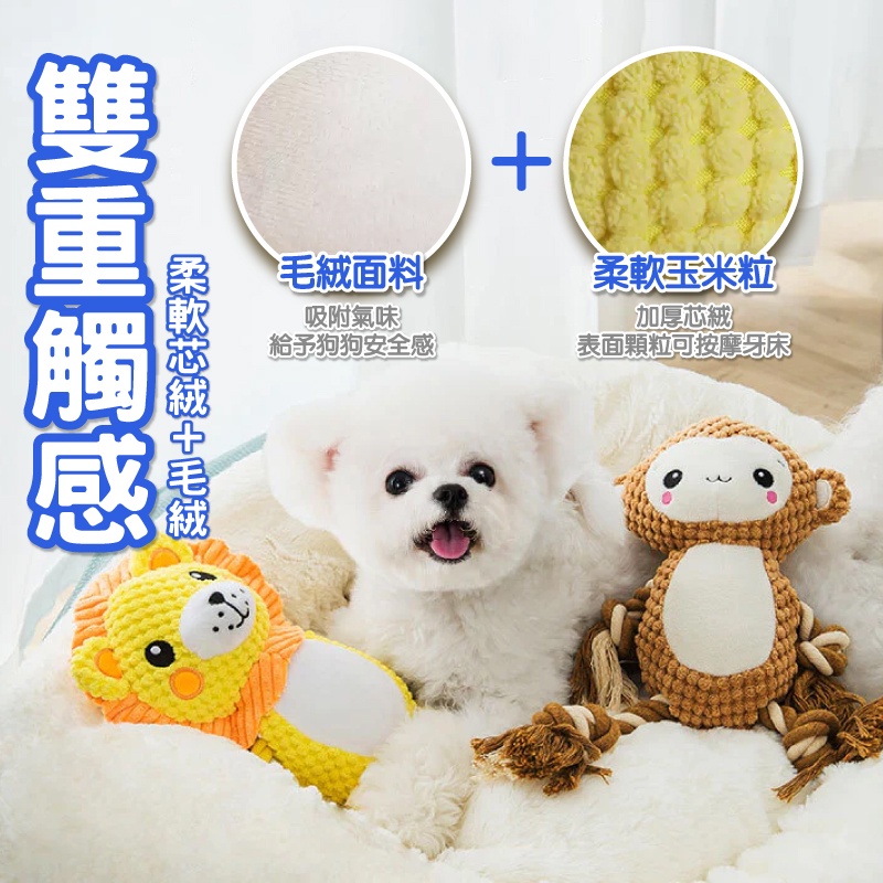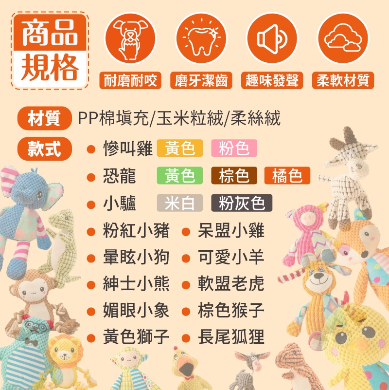 品名:玉米絨發聲玩具 ◎ 材質:PP棉填充/玉米粒絨/柔絲絨