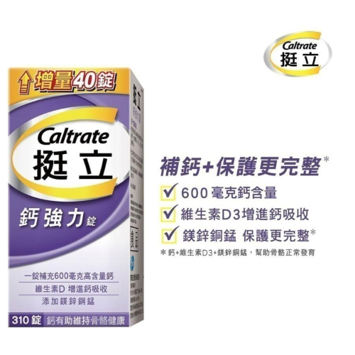 一錠補充600毫克高含量鈣 天天定量補充,有助於維持骨骼健康 鈣吸收率相當於牛奶 維生素 D能增進鈣吸收,幫助骨骼和牙齒的生長 添加鎂鋅銅錳 品名 Caltrate 挺立鈣強力錠 內容量/入數 310 錠 成分 碳酸鈣95%(碳酸鈣、麥芽糊精)、氧化鎂、微結晶狀纖維素、交聯羧甲基纖維素鈉、聚乙烯醇、二氧化鈦、氧化鋅、滑石粉、硫酸錳、膽鈣化醇(維生素D3)0.25%[辛烯基丁二酸鈉澱粉、蔗糖、抗壞血酸鈉(維生素C)(抗氧化劑)、中鏈三酸甘油酯、二氧化矽、生育醇(維生素E)(抗氧化劑)、膽鈣化醇(維生素D3)]、硬脂酸鎂、硫酸銅、大豆卵磷脂、氧化鐵(紅)、玉米糖膠、氧化鐵(黑)、氧化鐵(黃) 劑型 錠劑 使用方式 成人每日食用1~2錠,建議分次隨餐或餐後食用,一日請勿超過2錠,多食無益。 保存方式 使用後請蓋緊,並置於乾燥陰涼及兒童無法取得之處。 保存期限 2年 (商品依序出貨,收到商品時,所剩有效期間會較前述日期為短) 產地 台灣 食品業登錄字號 F-111912601-00000-4 產品責任險契約字號 美國國際產物保險 2900-0300000579-08 製造/進口商名稱 輝瑞生技股份有限公司 消費保健事業部 製造/進口商電話 0800-258000 製造/進口商地址 台北市中正區忠孝西路一段66號24樓 注意事項 (1) 孕婦及授乳婦在食用本產品前,請洽醫藥專業人員。 (2) 若不慎食用過量,應立即停用並諮詢醫師。 (3) 本品含有大豆卵磷脂。 (4) 鈣質與維生素D補充品。