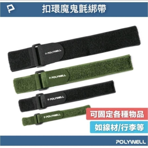 ◎ 產品:  POLYWELL 扣環式魔鬼氈萬用束帶 (2公分~5公分寬) ◎ 產品特色: 【自黏式魔鬼氈】黏貼力強, 可重複使用 【塑膠扣環設計】好串好拉, 使用方便 【不同寬度規格】依要整理和綑綁的物品粗細大小, 可搭配不同的寬度 【多種用途】可用於各種線材和電器的整理, 機車/腳踏車/嬰兒車物品綑綁, 雨衣褲腳固定, 腳架, 瑜珈墊... 等 ◎ 產品規格: 顏色: 黑色/綠色 長度: 20公分~140公分 材質: 尼龍 內容物: 自黏魔鬼氈*1 ◎ 下標須知:   1. 下標前請確認所需規格及型號,不確定時請多加詢問。   2. 賣場商品圖因拍攝光線與顯示器畫質不同,實品多少會有色差,無法接受者請勿下標。