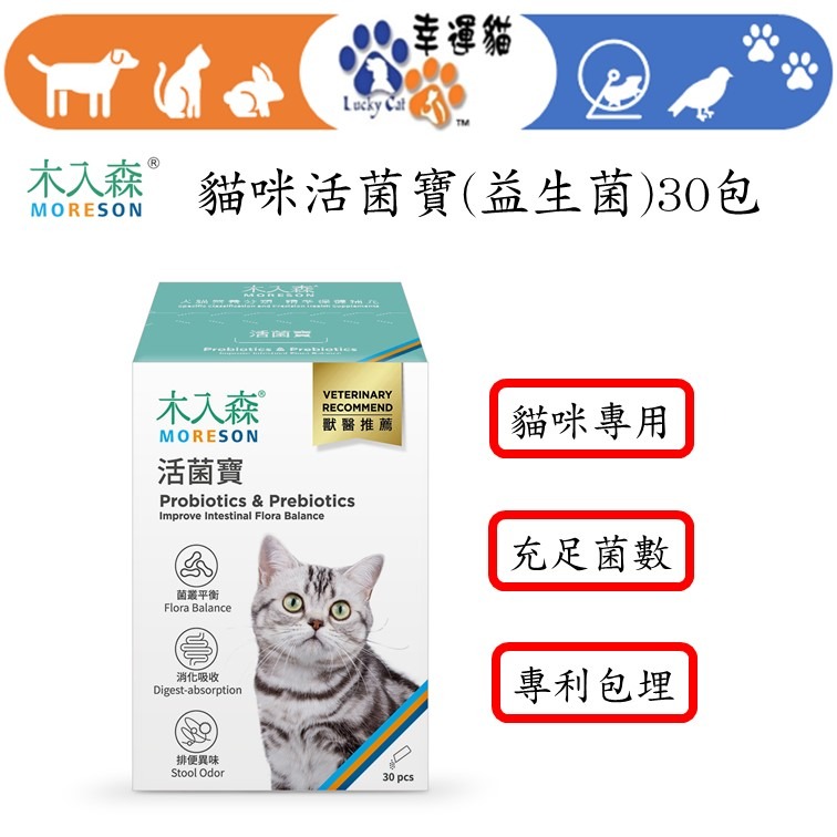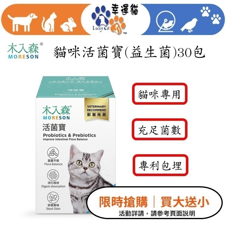 木入森貓咪活菌寶,給予貓咪專屬 LB2 綜合益生菌,有效調整細菌叢生態,搭配優質益生菌能源(半乳寡糖、果寡糖、水溶性膳食纖維),增進腸內菌叢品質,促進腸胃蠕動,使排便穩定正常,並使用美國專業 18 種類型綜合酵素,針對貓咪飲食,幫助消化。