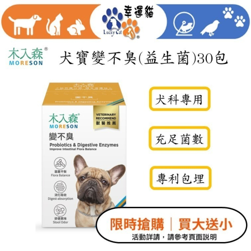 木入森 犬寶變不臭,狗狗益生菌全新升級,黃金有益菌提升至 60 億,獨家使用 FA2SPC 犬用專科益生菌,皆選擇犬腸優勢菌,精準模擬狗狗健康腸型態,搭配好菌ABC鐵三角,針對狗狗飲食幫助消化,使排便穩定正常。