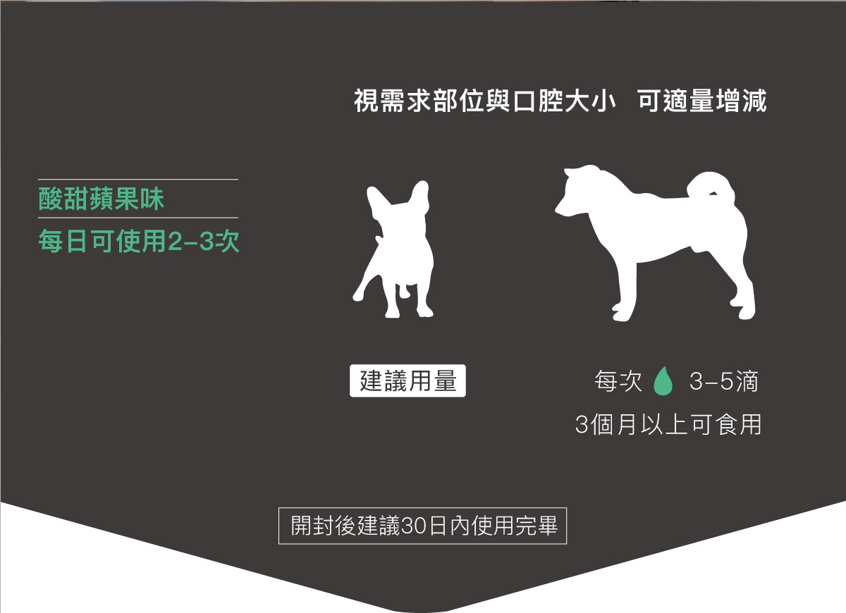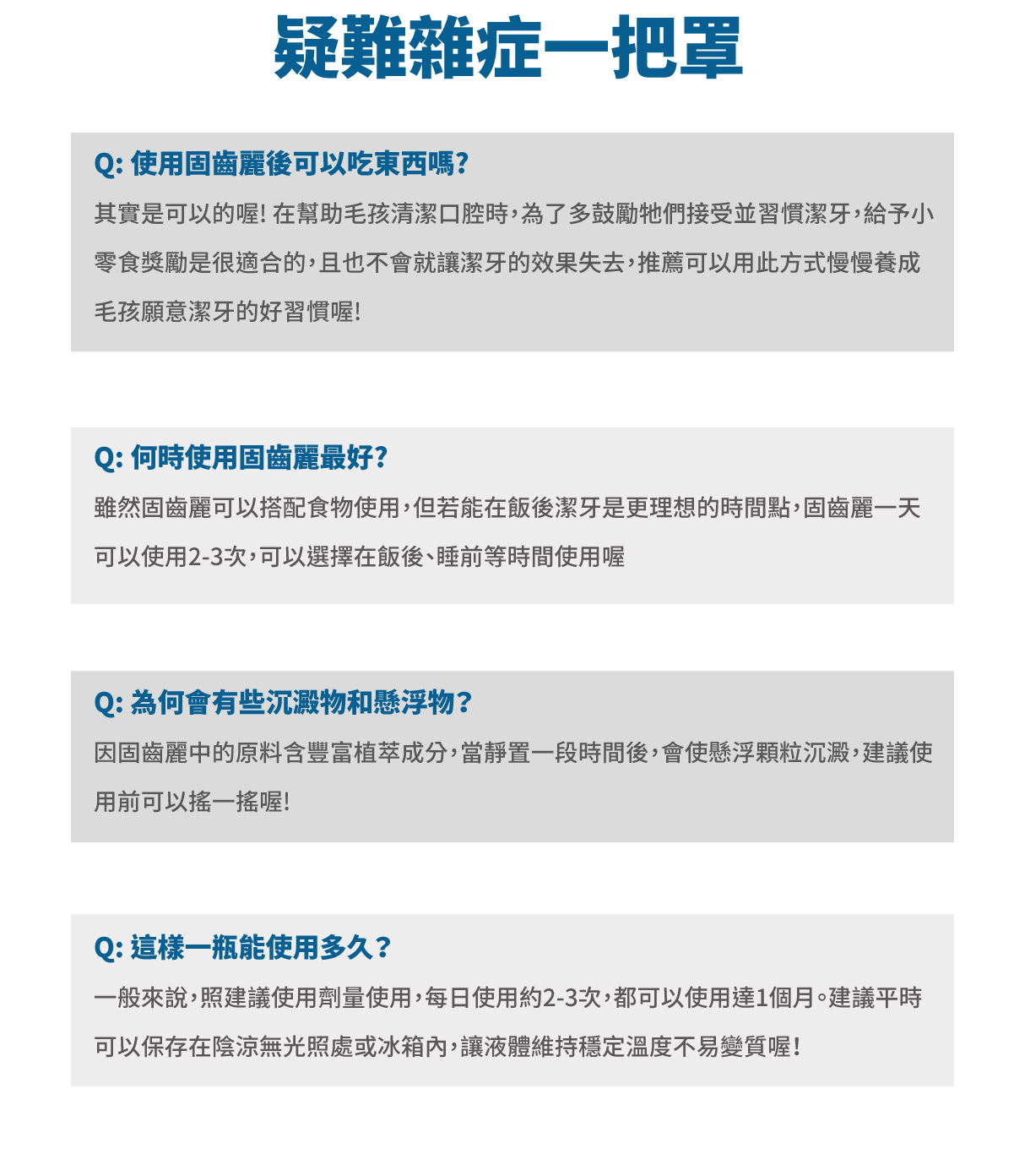 固齒麗為口腔清潔液體,可滴入毛孩口腔、滴入水或食物中(水/食物:固齒麗=10:1)或滴在潔牙工具上搭配使用,達到幫助口腔健康功效
