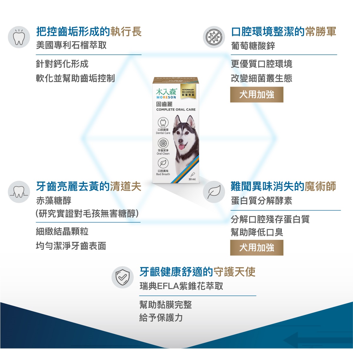 木入森犬寶固齒麗,保健口腔牙齒,潔齒 5 大成份,口腔護理,幫助控制牙垢,消除口腔異味,維護牙齦健康,「不愛刷牙、有口臭、有齒垢、嘴巴破」的狗狗皆適合使用。