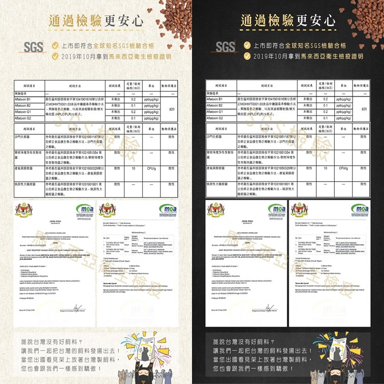 營養成份:蛋白質42%↑、脂肪16%↑、纖維5%↓、水分10%↓、鈣1.1%↑、磷1%↑、灰分9%↓、牛磺酸0.15%↑, 3840大卡/公斤