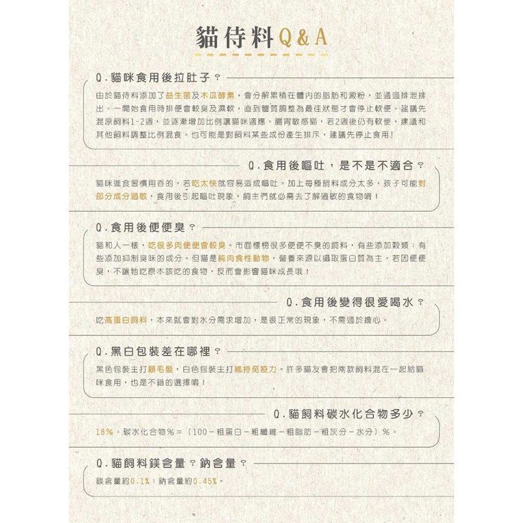 營養成份:蛋白質42%↑、脂肪16%↑、纖維5%↓、水分10%↓、鈣1.1%↑、磷1%↑、灰分9%↓、牛磺酸0.15%↑;白貓侍: 3840大卡/公斤