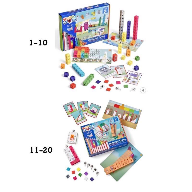 11-20 組合: 每組包含 155 個 MathLink 數字塊、52 個面板、44 張貼紙、10 張數字卡、10 張角色卡、15 張雙面寫字 'N' 擦拭活動卡、14 張滑板和輔助工具、帽子配件、1 支擦擦筆和 1 本活動指南 。