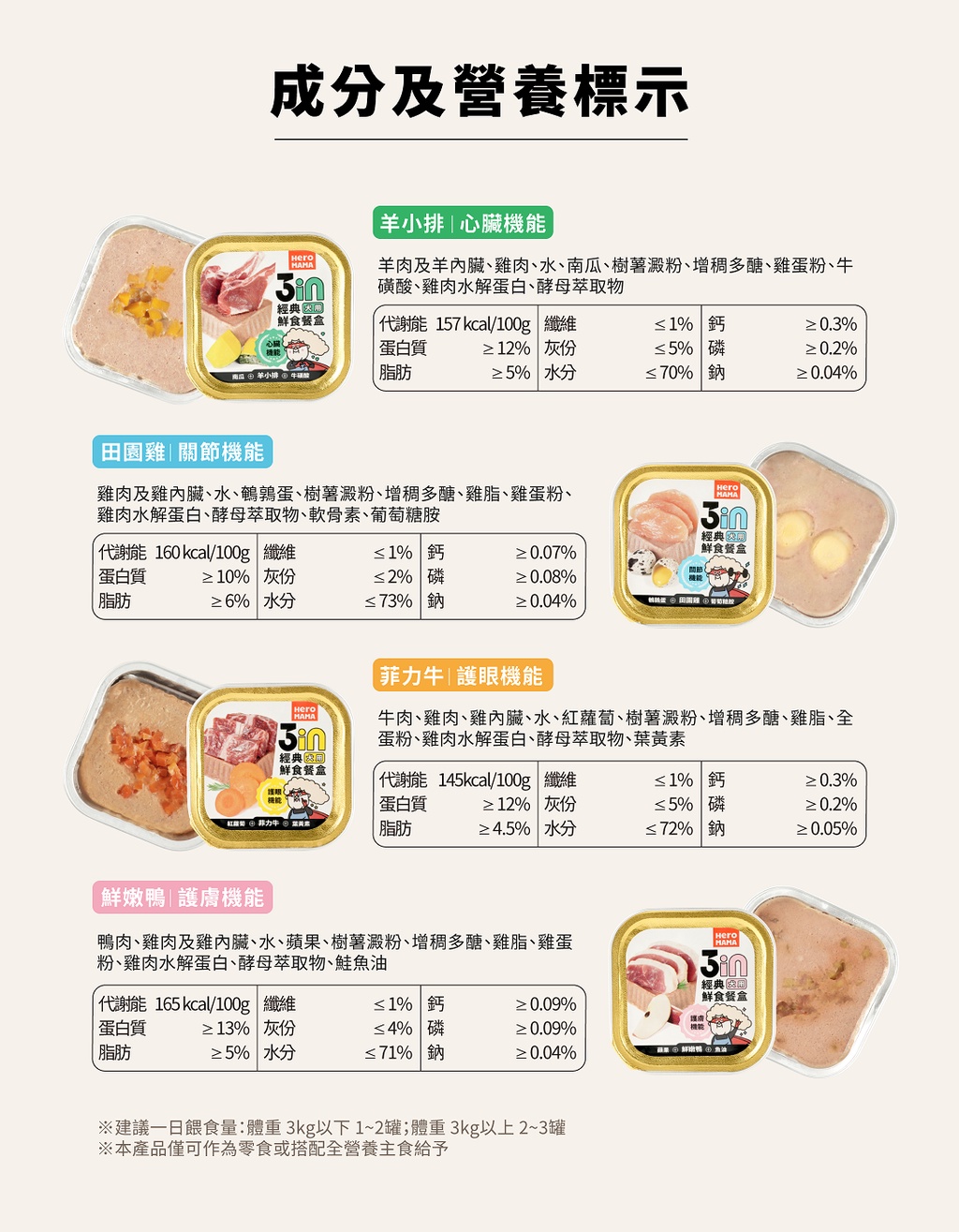 成分:雞肉及雞內臟、水、鵪鶉蛋、樹薯澱粉、增稠多醣、雞脂、雞蛋粉、軟骨素、葡糖醣胺、雞肉水解蛋白、酵母萃取物
