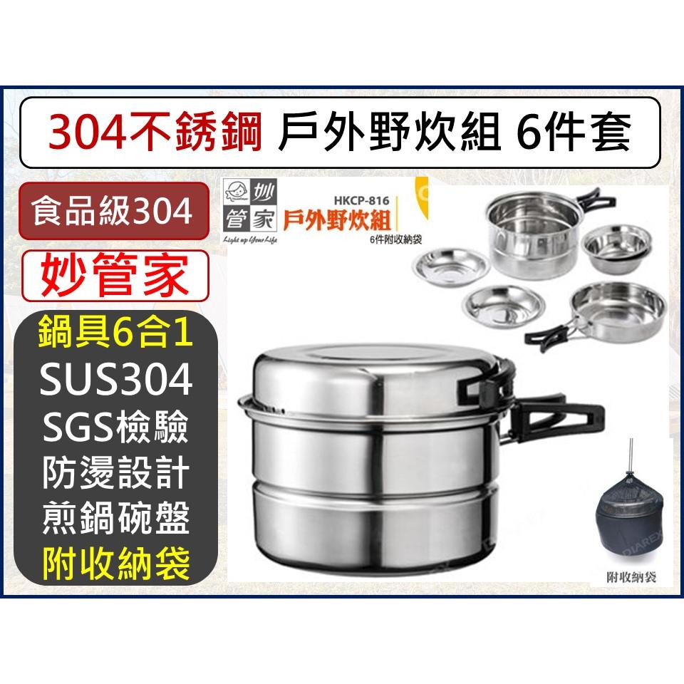 妙管家 304不鏽鋼 六件式戶外野炊組 6件套 附網袋 2人 不鏽鋼 野炊套鍋組 野營 套鍋組 套鍋 HKCP-816