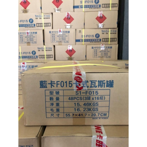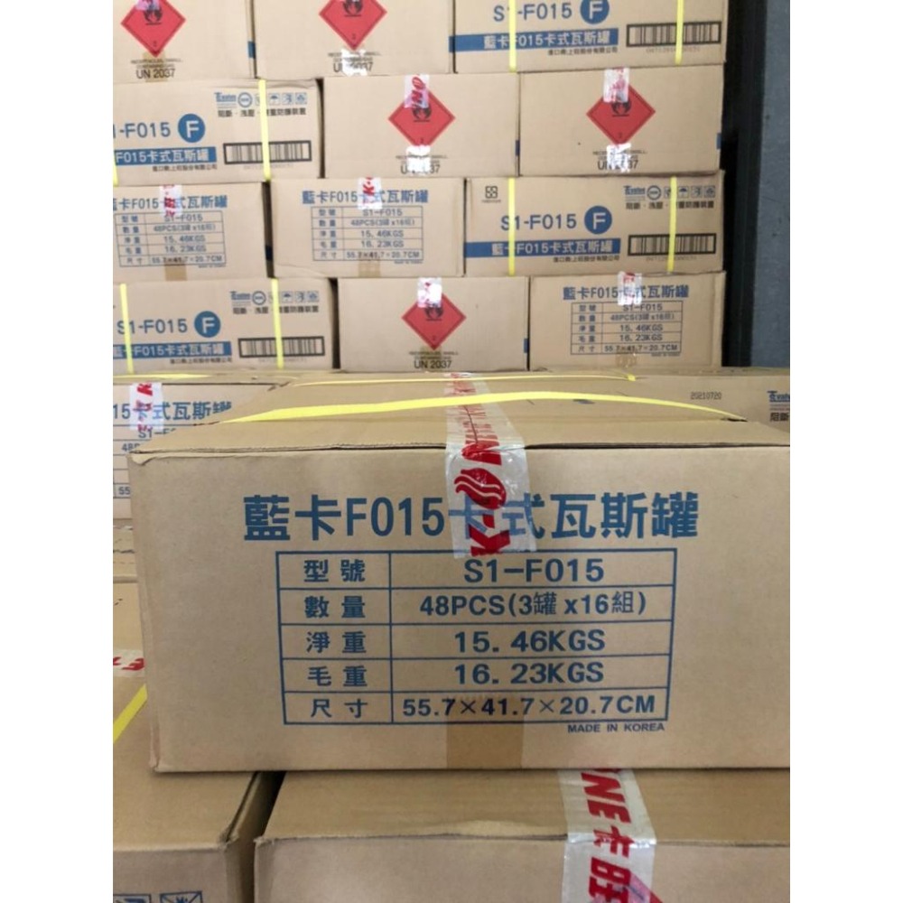 "⚠️【注意】⚠️ ⚠️瑕疵罐-為凹陷等狀況,估能仍正常可以使用,可以接受再下單喔!!⚠️ ⚠️瑕疵罐-為凹陷等狀況,估能仍正常可以使用,可以接受再下單喔!!⚠️ ⚠️瑕疵罐-為凹陷等狀況,估能仍正常可以使用,可以接受再下單喔!!⚠️ ⚠️滿百元才出貨⚠️請買兩組以上或搭配其他商品⚠️ ⚠️滿百元才出貨⚠️請買兩組以上或搭配其他商品⚠️ **最多__可以購買-1件卡式爐+2組瓦斯罐★可以1件卡式爐+2組瓦斯罐★可以1件卡式爐+2組瓦斯罐★ **最多__-可以購買-1件卡式爐+2組瓦斯罐★可以1件卡式爐+2組瓦斯罐★可以1件卡式爐+2組瓦斯罐★ 👉🏻【超取】__材積限制__【1單最多4組12入】【1單最多4組12入】【1單最多4組12入】 👉🏻【宅配】__材積限制__【1單最多1箱16組】【1單最多1箱16組】【1單最多1箱16組】 ⚠️滿百元才出貨⚠️請買兩組以上或搭配其他商品⚠️ 🚛【適合大宗採購】,歡迎聊聊、亦可至本店洽談合作!😘 🚚到店自取會有【運費回饋】喔!🌈 ☎️客服專線 : 0910818155 🙏【說明】🙏 📦️如遇連續假日,請耐心等候🧡感恩(六、日、例假日原則不出貨) 🕛出貨後約2-3工作天到貨 【商品介紹】 ⚠️瑕疵罐-為凹陷等狀況,估能仍正常可以使用,可以接受再下單喔!!⚠️ 品名:藍卡F015卡式瓦斯罐 型號:S1-F015 內容物:純丁烷 重量:220G 保存期限:5年 製造商:上旺股份有限公司 **阻斷-洩壓-雙重安全裝置! 當壓力上升🔝 1.截斷瓦斯源 2.開啟分流孔 ***與紅卡差異在於容量數! 甚麼是三線雙封釋壓孔? 請參考影片https://www.youtube.com/watch?v=8-mxrntG4xY ◎特色 *符合CNS國家安全標準 *ISO認證工廠製造 *純丁烷氣體安全性更高、戶內外皆適用 *適用於各種通用罐器具 ◎使用說明 *第一段先截斷瓦斯源讓爐火熄滅,斷絕受熱來源 *第二段為罐體分流孔,讓瓶內瓦斯洩壓,減少罐體爆裂與瓦斯氣爆之危險 ◎貼心小提醒 *請勿重複填充使用。 *避免在烈日下、沙灘上、草叢及不平處使用。 *換裝時,遠離火源,並依圖示正確裝妥才可點火。 *若有漏氣聲或瓦斯臭味,不可點火,必須依上項告知方法檢查是否正確,或爐具開關是否不良。 *為防止爆裂事故,瓦斯罐需確認全部用完之後與其它垃圾分類拋棄,不可投入火中燃燒。 *嚴禁把瓦斯罐放在電熱器、瓦斯罐、暖爐正前方或高溫旁。 *不用時存放於攝氏40度以下乾燥及兒童不易觸及之處若發現生鏽請盡早使用完。 *嚴禁空罐回收罐氣,避免發生危險。