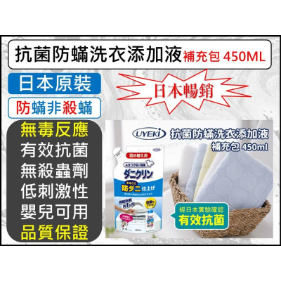 UYEKI 防螨洗衣精450ml/洗衣添加液 日本原裝 日本過敏協會推薦 ****狂賀!!!UYEKI 防螨洗衣精 !!!蟬聯排行榜一週!!**** 各大部落客的支持與愛護~! 【品名】UYEKI 防蟎抗菌洗衣添補充包 【產地】日本 【淨容量】450ml 【保存期限】5年 【特點】*本產品為日本過敏反應協會推薦品。 *不含殺蟲劑;對皮膚刺激小,成分不會影響人體健康。 *擔心殺蟲劑副作用的消費者也可放心使用。(已通過皮膚過敏試驗) 【用途】洗衣後具防蟎效果。 【使用方法】洗衣機加入柔軟劑的步驟時放入本產品即可。 和漂白劑、柔軟劑可以一起使用。 【注意事項】效果持續約1個月左右 【成分】脂肪羧酸酯、表面活性劑、水等。
