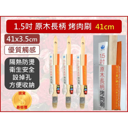 ⚠️【注意】⚠️ ☎️大宗採購可私、亦可至本店洽談合作!😘 ☎️客服專線 : 0910818155 【說明】 📦️當天下單,中機率當天出貨,大機率隔天出貨,小機率第二天出貨。 📦️如遇連續假日,請耐心等候🧡(六、日、例假日原則不出貨) 📦️出貨後約2-3工作天到貨 【商品介紹】 產品:1.5吋原木長柄烤肉刷 尺寸:長41x寬3.5x高1cm 產品重量:35 g 材質:豬鬃 鐵 木材 保存期限:10年 產地:中國 【商品特性】 ✅鬃毛彈性佳 塗刷均勻 減少刷痕 ✅實木手把 握感舒適 ✅接口加固處理 耐用 堅固 110年