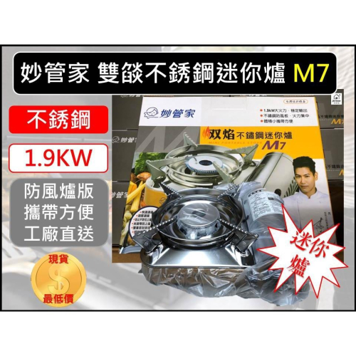 "⚠️【注意】⚠️ 可搭配本賣場瓦斯罐,全通用 👉🏻【超取】-材積限制__【1單最多件4】【1單最多件4】【1單最多件4】 👉🏻【宅配】-材積限制__【最多1箱(10件)】【最多1箱(10件)】【最多1箱(10件)】 🚛【適合大宗採購】,歡迎聊聊、亦可至本店洽談合作!😘 🚚到店自取會有【運費回饋】喔!🌈 ☎️客服專線 : 0910818155 🙏【說明】🙏 📦️如遇連續假日,請耐心等候🧡感恩(六、日、例假日原則不出貨) 🕛出貨後約2-3工作天到貨 💰蝦皮代開發票,發票如需開立統編抬頭,請結帳前,務必填寫完整" 【商品說明】 品名:妙管家 雙焰不銹鋼迷你爐 型號:M7 尺寸:24.5 x 20 x 10 公分 材質:鋼板、鋁合金、不銹鋼 消耗功率:1.7Kw 耗氣量:140G/hr BSMI:(I)C24793822 商品特色: 1.不鏽鋼防風板,火力集中更穩定 2.不鏽鋼爐面,好清洗 3.體積小攜帶方便 4.雙爐心設計,大火力更快烹調食材