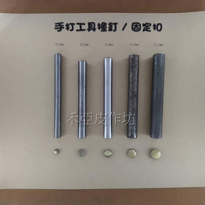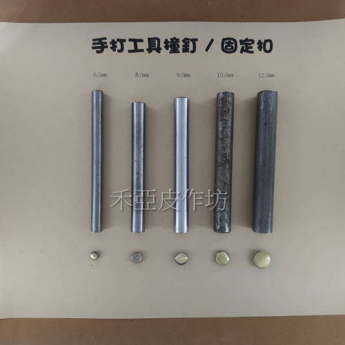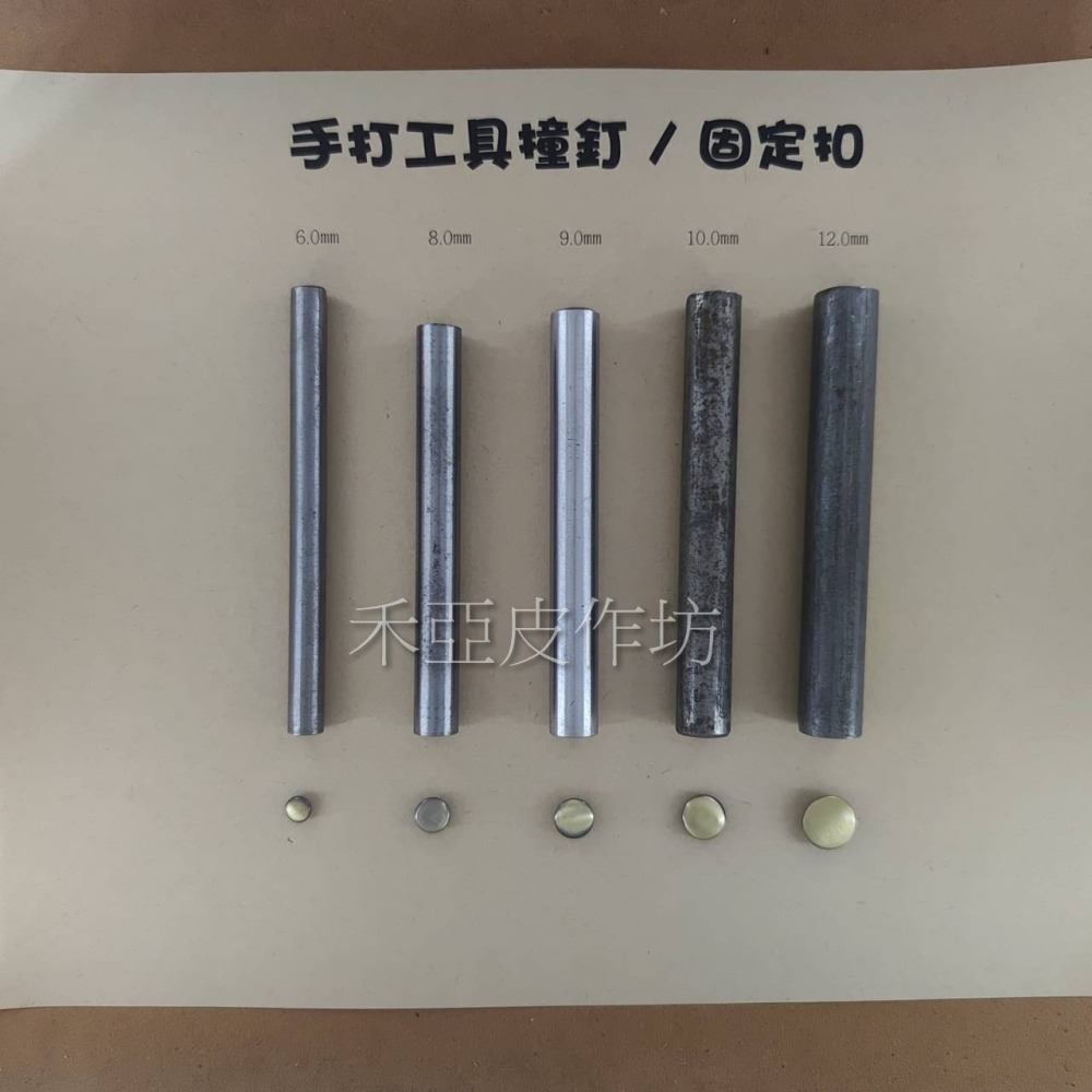 安裝<<撞釘/固定扣>>的工具有5種規格:6㎜、8㎜、9㎜、10㎜、12㎜,安裝時建議使用相對應大小的<<撞釘/固定扣>>五金, 較能保護釦子釘上時不易變形。 如使用<<撞釘/固定扣>>6㎜,則需使用相對應6㎜手打工具, 若使用不同大小的手打工具時, 容易造成釦子變形及損壞。 所以通常會建議選好釦子大小後, 再來選擇相對應的工具比較適合!