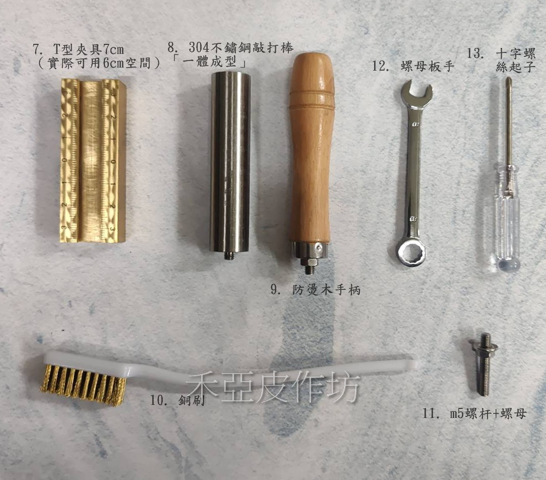 7. T型夾具7cm (實際可用6cm空間) 8. 304不鏽鋼敲打棒「一體成型」 9. 防燙木手柄 10. 銅刷 11. m5螺杆+螺母 12. 螺母板手 13. 十字螺絲起子