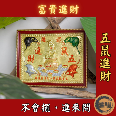 a 鼠為十二生肖之首,因其繁殖力極強,古時就有( 五鼠運財 )的吉祥象徵,寓意財源滾滾,利潤無窮 五隻福鼠滿懷金銀財寶,來催動貴人運。 象徵五福臨門、萬事如意、招財進寶。